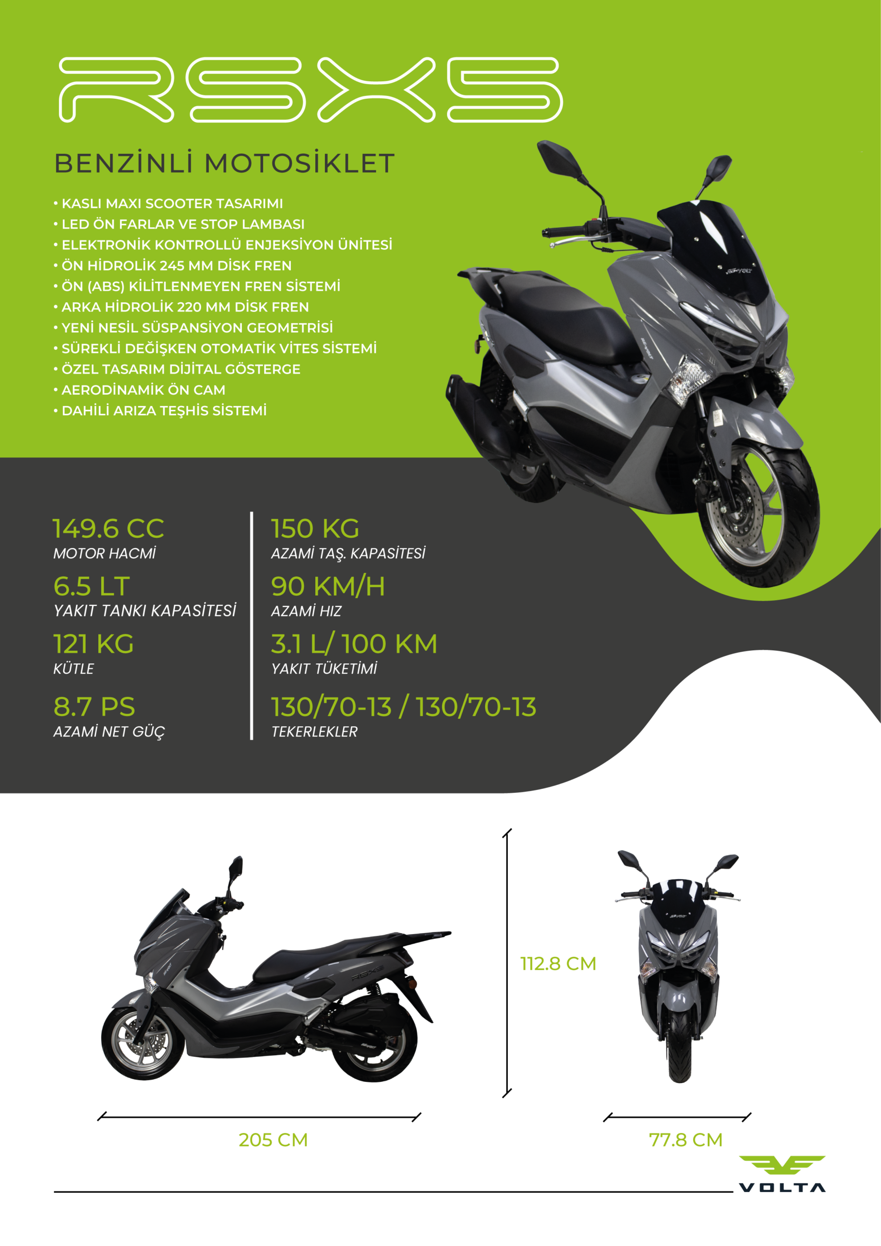 Güç, stil ve ekonomi RSX5’te bir araya geliyor.Modern şehir yaşamına mükemmel uyum sağlayan bu maxi scooter, her yolculukta güvenli bir partneriniz olacak.