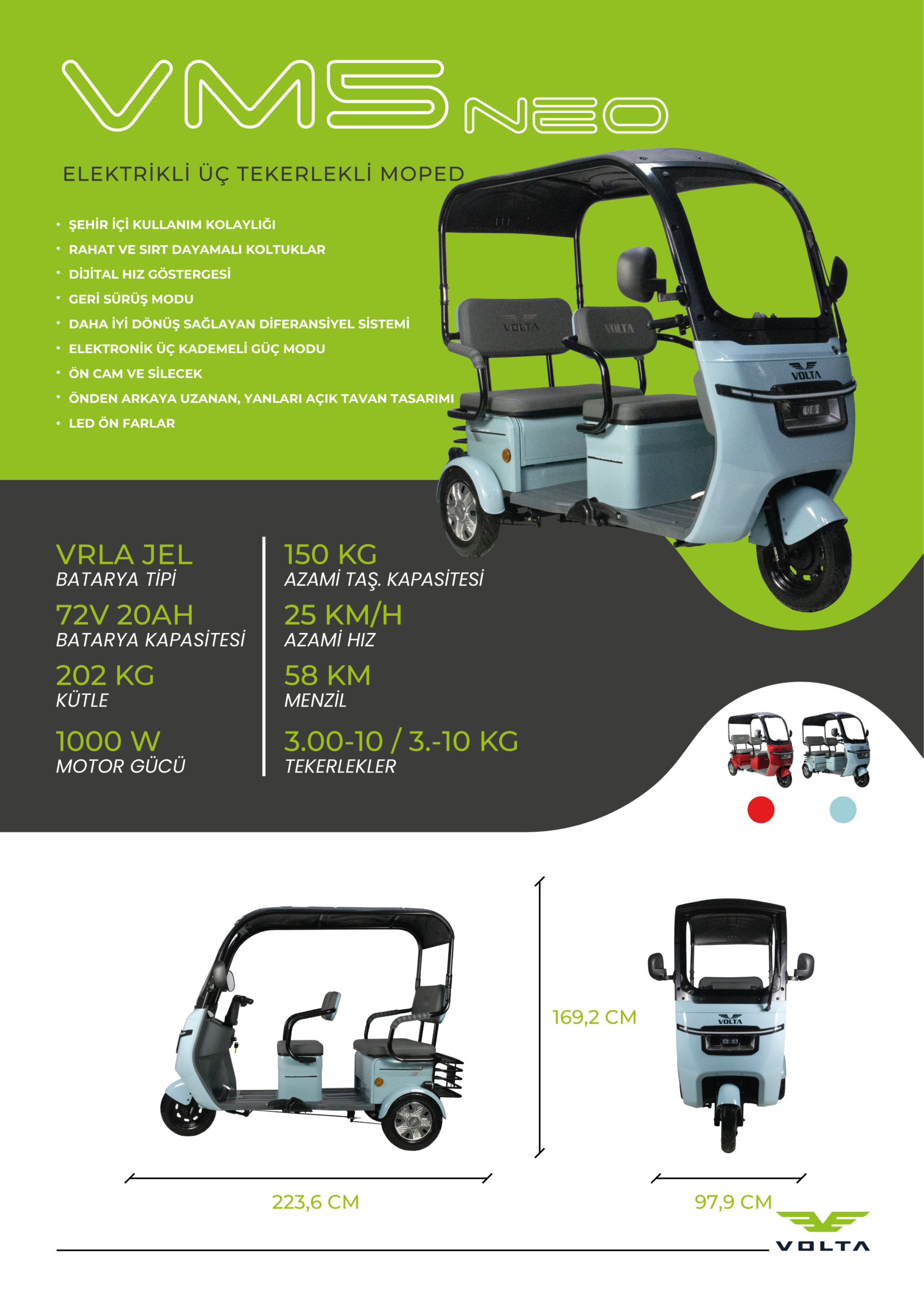 Volta VM5 Neo, şehir içi ulaşıma özel olarak geliştirilen yenilikçi bir elektrikli 3 tekerlekli motosiklet modelidir. 1000W gücündeki elektrikli motoru, günlük kullanımda yüksek performans ve sessiz sürüş avantajı sunarken, 25 km/h azami hızı ile güvenli ve dengeli bir deneyim sağlar. Kompakt boyutları, rahat oturma düzeni ve kullanıcı dostu kontrolleri sayesinde hem bireysel kullanıcılar hem de yaşlı veya mobilite desteği arayanlar için ideal bir seçenektir.