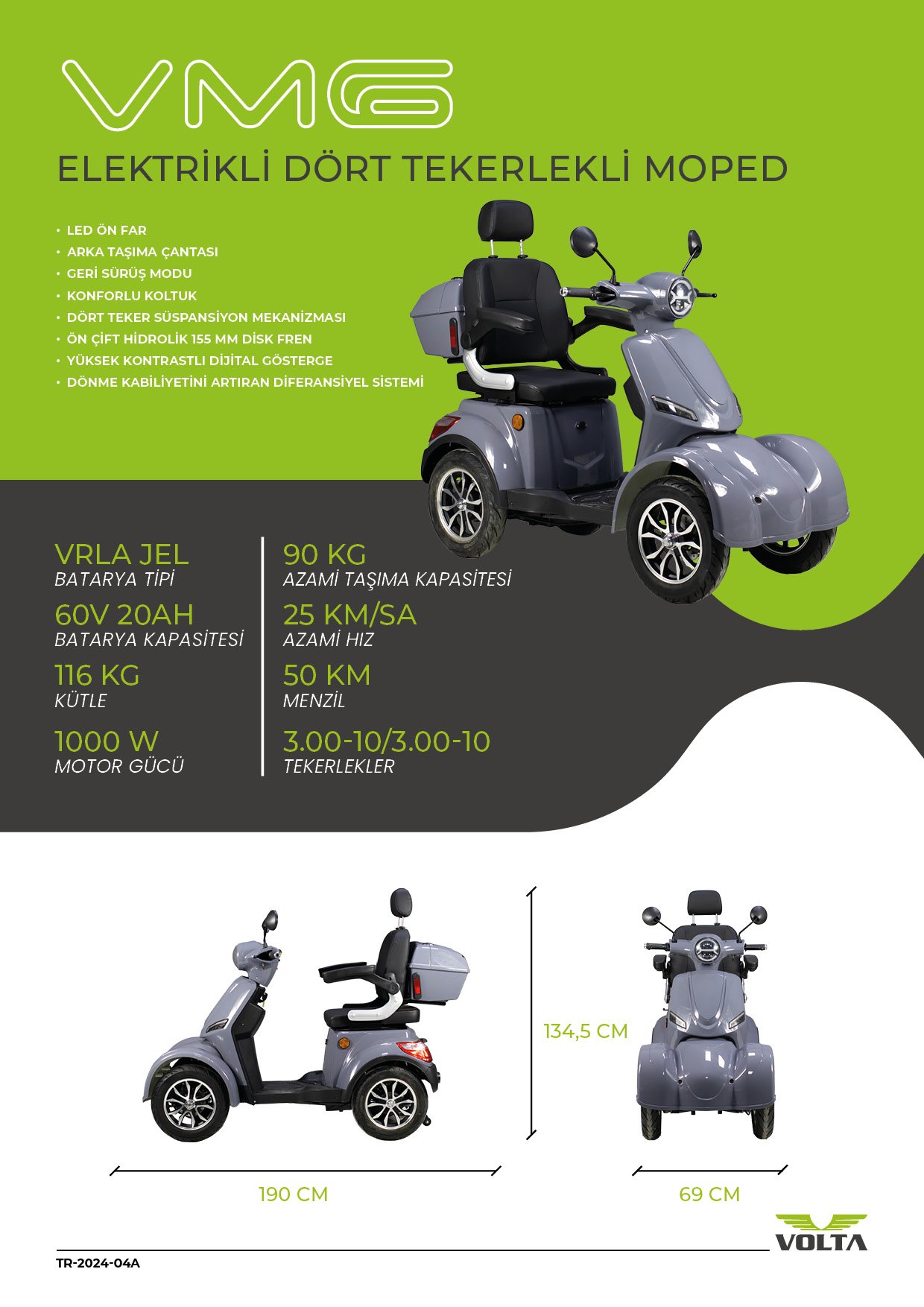Volta VM6, şehir içi ve uzun mesafeli yolculuklarda yüksek performans, konfor ve güvenlik sunan yenilikçi bir 4 tekerlekli elektrikli moped modelidir.