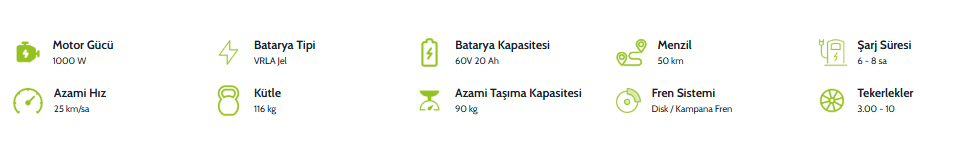 1000W motor gücü ve 60V 20Ah VRLA Jel batarya, Volta VM6’nın günlük kullanımda etkileyici bir performans sergilemesini sağlar.