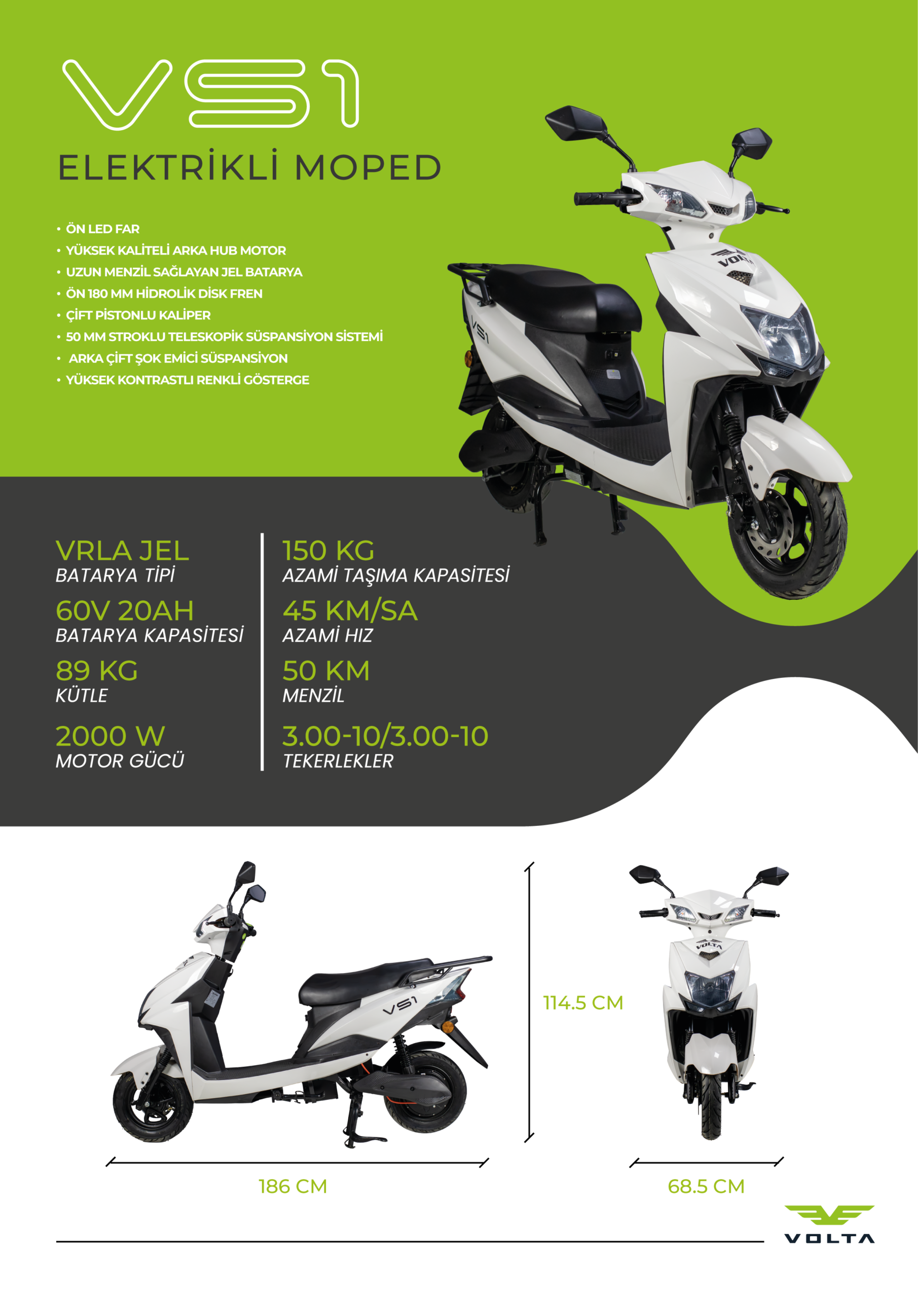 Şehir içi ulaşımda hem çevre dostu hem de ekonomik bir çözüm sunan Volta VS1 elektrikli moped, güvenlik, konfor ve performansı bir araya getirir.