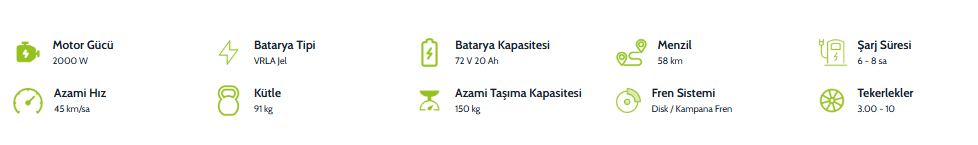 72V 20Ah VRLA Jel batarya, tek şarjla 58 km’ye kadar menzil sunarak günlük yolculuklarınızı kolayca tamamlamanızı sağlar.